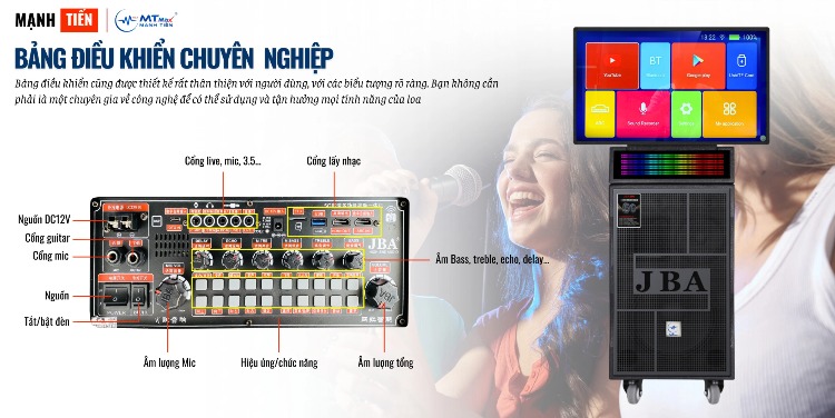 cung cấp nhiều tùy chọn kết nối, bao gồm Bluetooth, USB, HDMI, thẻ TF, AUX, OTG IN, cổng micro, và cổng guitar. Điều này có nghĩa là bạn có thể kết nối nó với hầu hết mọi thiết bị và thiết lập một buổi tiệc âm nhạc hoàn hảo chỉ trong vài phút.