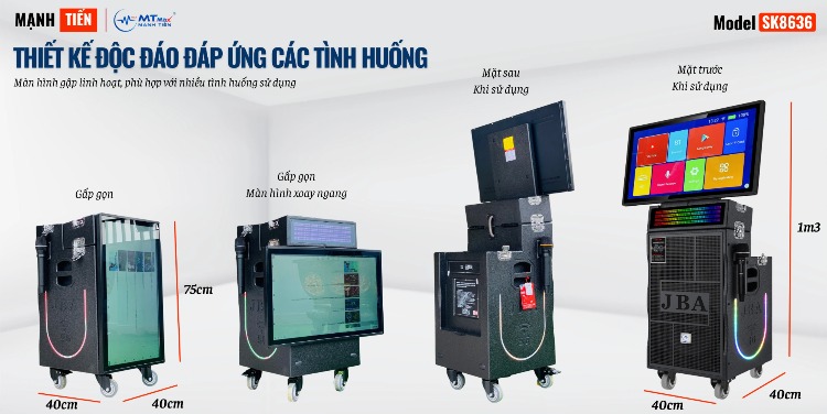 không chỉ là một chiếc loa, mà còn là một tác phẩm nghệ thuật với thiết kế hiện đại và sang trọng với màn hình gập linh hoạt. Kích thước 1m3 x 40 x 40 cm khi sử dụng, nó tỏa sáng trong mọi không gian và là điểm nhấn hoàn hảo cho bất kỳ phòng nào.